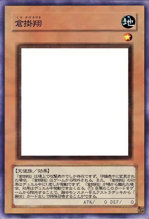 | 「倉掛翔」は場上で攻撃表示でしか存在できず、守備表示に変更された場合、「倉掛翔」はゲームから除外される。また、「倉掛翔」の効果はデュエル中に1度しか発動できず、「倉掛翔」が場から離れた場合、効果はデュエル中発動できなくなる。①:自軍のこのカードをゲームから除外することで、融合モンスターをエクストラデッキから「融合」カードなしで特殊召喚することができる。 | |||