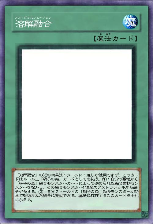 | 「溶解融合」の②の効果は1ターンに1度しか使用できず、このカードはルール上「硝子の森」カードとしても扱う。①:自分の墓地から「硝子の森」融合モンスターカードによって決められた融合素材モンスターを除外し、その融合モンスター1体をエクストラデッキから融合召喚する。②:自分フィールドの「硝子の森」融合モンスターが効果で破壊された場合に発動できる。墓地に存在するこのカードを手札に加える。 | |||