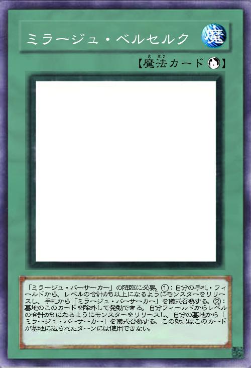 | 「ミラージュ・バーサーカー」の降臨に必要。①:自分の手札・フィールドから、レベルの合計が8以上になるようにモンスターをリリースし、手札から「ミラージュ・バーサーカー」を儀式召喚する。②:墓地のこのカードを除外して発動できる。自分フィールドからレベルの合計が8になるようにモンスターをリリースし、自分の墓地から「ミラージュ・バーサーカー」を儀式召喚する。この効果はこのカードが墓地に送られたターンには使用できない。 | |||