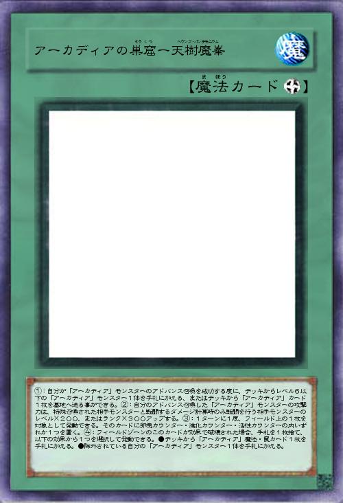 | ①:自分が「アーカディア」モンスターのアドバンス召喚を成功する度に、デッキからレベル6以下の「アーカディア」モンスター1体を手札に加える、またはデッキから「アーカディア」カード1枚を墓地へ送る事ができる。②:自分のアドバンス召喚した「アーカディア」モンスターの攻撃力は、特殊召喚された相手モンスターと戦闘するダメージ計算時のみ戦闘を行う相手モンスターのレベル×200、またはランク×300アップする。③:1ターンに1度、フィールド上の1枚を対象として発動できる。そのカードに卵塊カウンター・進化カウンター・活性カウンターの内いずれか1つを置く。④:フィールドゾーンのこのカードが効果で破壊された場合、手札を1枚捨て、以下の効果から1つを選択して発動できる。●デッキから「アーカディア」魔法・罠カード1枚を手札に加える。●除外されている自分の「アーカディア」モンスター1体を手札に加える。 | |||