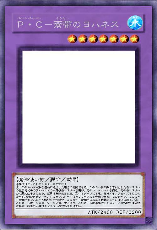 | 水属性「P・C」モンスター×2体以上 ①:このカードが融合召喚に成功した場合に発動できる。このカードの融合素材としたモンスターの数まで相手のフィールドの水属性モンスターを選び、そのコントロールを得る。そのモンスターの攻撃力は半分になり、効果は無効化される。②:1ターンに1度、自分メインフェイズ1にこのカード以外の自分フィールドのモンスター1体をリリースして発動できる。このターン、このカードが相手モンスターと戦闘を行う場合、このカードが相手に与える戦闘ダメージは倍になる。③:このカードがモンスターゾーンに存在する限り、このカードは水属性モンスターとの戦闘では破壊されず、相手の水属性モンスターの効果を受けない。 | |||