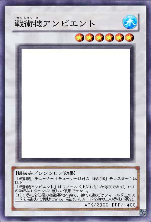 | 「戦術機」チューナー+チューナー以外の「戦術機」モンスター1体以上 「戦術機アンビエント」はフィールド上に1枚しか存在できず、(1)の効果は1ターンに1度しか使用できない。 (1):手札を任意の枚数墓地へ捨て、捨てた数だけフィールド上のカードを選択して発動できる。選択したカードを持ち主の手札に戻す。 | |||