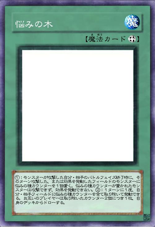 | ①:モンスターが攻撃した自分・相手のバトルフェイズ終了時に、そのターン攻撃した、または効果を発動したフィールドのモンスターに悩みの種カウンターを1個置く。悩みの種カウンターが置かれたモンスターは攻撃できず、効果を発動できない。②:1ターンに1度、自分・相手フィールドに悩みの種カウンターを全て取り除いて発動できる。お互いのプレイヤーは取り除いたカウンター2個につき1枚、自身のデッキからドローする。 | |||