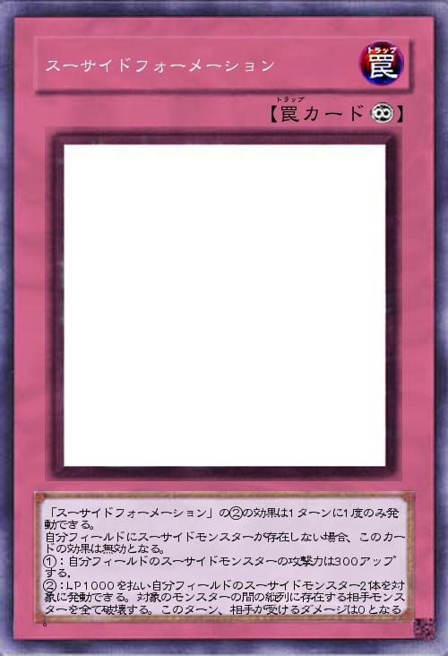| 「スーサイドフォーメーション」の②の効果は1ターンに1度のみ発動できる。 自分フィールドにスーサイドモンスターが存在しない場合、このカードの効果は無効となる。 ①:自分フィールドのスーサイドモンスターの攻撃力は300アップする, ②:LP1000を払い自分フィールドのスーサイドモンスター2体を対象に発動できる。対象のモンスターの間の縦列に存在する相手モンスターを全て破壊する。このターン、相手が受けるダメージは0となる。 | |||