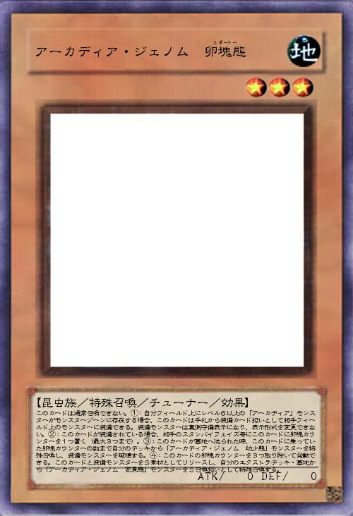 | このカードは通常召喚できない。①:自分フィールド上にレベル6以上の「アーカディア」モンスターがモンスターゾーンに存在する場合、このカードは手札から装備カード扱いとして相手フィールド上のモンスターに装備できる。装備モンスターは裏側守備表示になり、表示形式を変更できない。②:このカードが装備されている場合、相手のスタンバイフェイズ毎にこのカードに卵塊カウンターを1つ置く(最大3つまで)。③:このカードが墓地へ送られた時、このカードに乗っていた卵塊カウンターの数まで自分のデッキから「アーカディア・ジェノム 幼少態」モンスターを特殊召喚し、装備モンスターを破壊する。④:このカードの卵塊カウンターを3つ取り除いて発動できる。このカードと装備モンスターをS素材としてリリースし、自分のエクストラデッキ・墓地から「アーカディア・ジェノム 変異態」モンスターをS召喚扱いとして特殊召喚する。 | |||