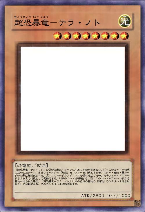 | 「超恐暴竜-テラ・ノト」の③の効果は1ターンに1度しか使用できない。①:このカードが召喚に成功したターン、自分フィールドの「超恐」モンスターを対象とするモンスター・魔法・罠カードの効果は無効化される。②:このカードがアドバンス召喚に成功した時、相手フィールドのカードを2枚まで対象として発動できる。対象のカードを破壊する。③:このカードがフィールドから墓地へ送られた場合、「超恐暴竜-テラ・ノト」以外の自分の墓地の「超恐」モンスター1体を対象として発動できる。そのモンスターを特殊召喚する。 | |||
