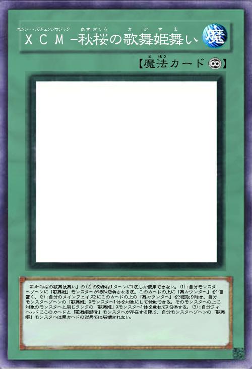 | 「XCM-秋桜の歌舞伎舞い」の(2)の効果は1ターンに1度しか使用できない。(1):自分モンスターゾーンに「歌舞姫」モンスターが特殊召喚される度、このカードの上に「舞カウンター」を1個置く、(2):自分のメインフェイズ2にこのカードの上の「舞カウンター」を3個取り除き、自分モンスターゾーンの「歌舞姫」Xモンスター1体を対象にして発動できる。そのモンスターの上に対象のモンスターと同じランクの「歌舞姫」Xモンスター1体を重ねてX召喚する。(3):自分フィールドにこのカードと「歌舞姫詩音」モンスターが存在する限り、自分モンスターゾーンの「歌舞姫」モンスターは罠カードの効果では破壊されない。 | |||