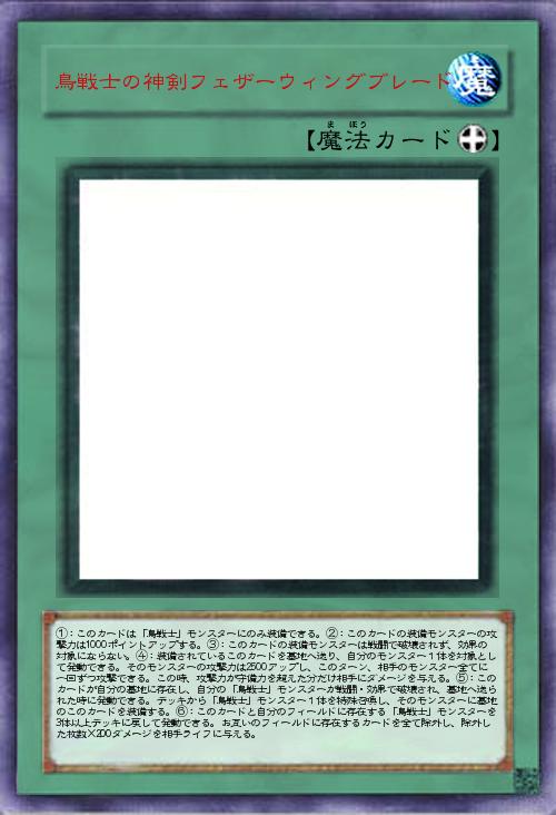 | ①:このカードは「鳥戦士」モンスターにのみ装備できる。②:このカードの装備モンスターの攻撃力は1000ポイントアップする。③:このカードの装備モンスターは戦闘で破壊されず、効果の対象にならない。④:装備されているこのカードを墓地へ送り、自分のモンスター1体を対象として発動できる。そのモンスターの攻撃力は2500アップし、このターン、相手のモンスター全てに一回ずつ攻撃できる。この時、攻撃力が守備力を超えた分だけ相手にダメージを与える。⑤:このカードが自分の墓地に存在し、自分の「鳥戦士」モンスターが戦闘・効果で破壊され、墓地へ送られた時に発動できる。デッキから「鳥戦士」モンスター1体を特殊召喚し、そのモンスターに墓地のこのカードを装備する。⑥:このカードと自分のフィールドに存在する「鳥戦士」モンスターを3体以上デッキに戻して発動できる。お互いのフィールドに存在するカードを全て除外し、除外した枚 | |||