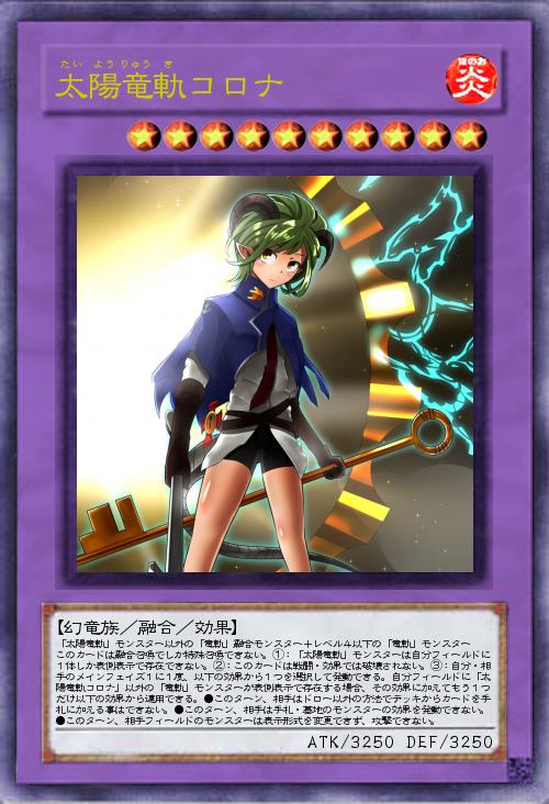 | 「太陽竜軌」モンスター以外の「竜軌」融合モンスター+レベル4以下の「竜軌」モンスター このカードは融合召喚でしか特殊召喚できない。①:「太陽竜軌」モンスターは自分フィールドに1体しか表側表示で存在できない。②:このカードは戦闘・効果では破壊されない。③:自分・相手のメインフェイズ1に1度、以下の効果から1つを選択して発動できる。自分フィールドに「太陽竜軌コロナ」以外の「竜軌」モンスターが表側表示で存在する場合、その効果に加えてもう1つだけ以下の効果から適用できる。●このターン、相手はドロー以外の方法でデッキからカードを手札に加える事はできない。●このターン、相手は手札・墓地のモンスターの効果を発動できない。●このターン、相手フィールドのモンスターは表示形式を変更できず、攻撃できない。 | |||