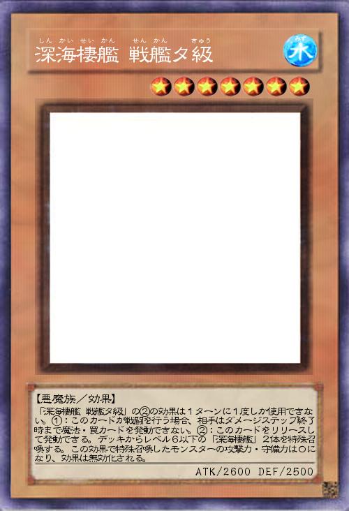 | 「深海棲艦 戦艦タ級」の②の効果は1ターンに1度しか使用できない。①:このカードが戦闘を行う場合、相手はダメージステップ終了時まで魔法・罠カードを発動できない。②:このカードをリリースして発動できる。デッキからレベル6以下の「深海棲艦」2体を特殊召喚する。この効果で特殊召喚したモンスターの攻撃力・守備力は0になり、効果は無効化される。 | |||