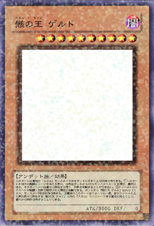 | このカードは墓地の「スカル」モンスター3体をデッキに戻すことで特殊召喚できる。①このカードが相手に戦闘ダメージを与える度に、相手はデッキから3枚のモンスターカードを選び、墓地に送る。そのモンスターは墓地に存在する限り、効果を発動することができない。②フィールドのこのカードが戦闘・効果で破壊された場合に発動できる。デッキから「骸の王 ゲルド」以外の「スカル」モンスター1体を特殊召喚する。③墓地のこのカードは1ターンに一度、自分フィールド上に表側表示で存在する「骸の王 ゲルド」以外の「スカル」モンスター1体を墓地に送ることで、墓地から特殊召喚することができる。 | |||
