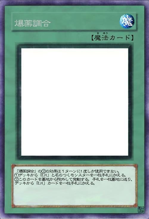| 「爆薬調合」の②の効果は1ターンに1度しか使用できない。 ①デッキから「EH」と名のつくモンスターを一枚手札に加える。 ②このカードを墓地から除外して発動する。手札を一枚墓地に送り、デッキから「EH」カードを一枚手札に加える。 | |||