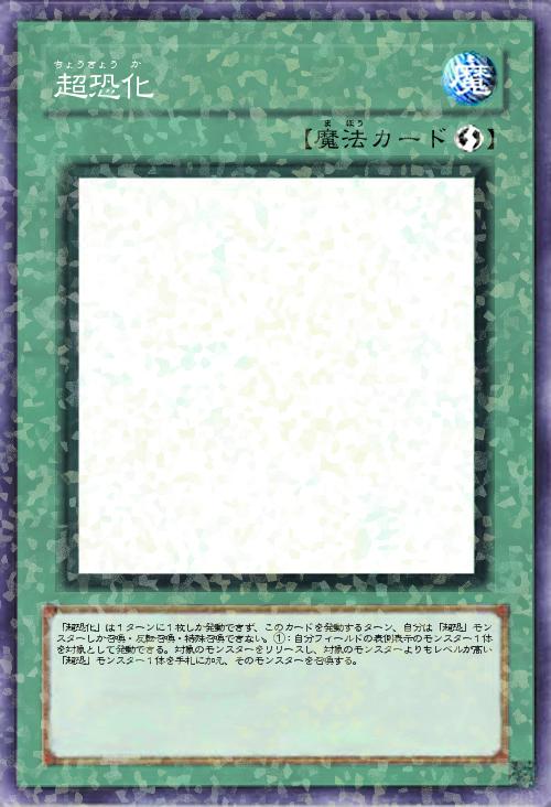 | 「超恐化」は1ターンに1枚しか発動できず、このカードを発動するターン、自分は「超恐」モンスターしか召喚・反転召喚・特殊召喚できない。①:自分フィールドの表側表示のモンスター1体を対象として発動できる。対象のモンスターをリリースし、対象のモンスターよりもレベルが高い「超恐」モンスター1体を手札に加え、そのモンスターを召喚する。 | |||