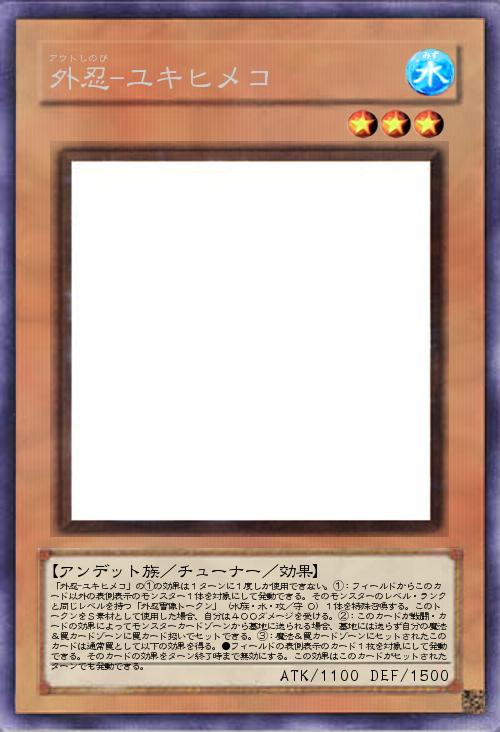 | 「外忍-ユキヒメコ」の①の効果は1ターンに1度しか使用できない。①:フィールドからこのカード以外の表側表示のモンスター1体を対象にして発動できる。そのモンスターのレベル・ランクと同じレベルを持つ「外忍雪像トークン」(水族・水・攻/守 0)1体を特殊召喚する。このトークンをS素材として使用した場合、自分は400ダメージを受ける。②:このカードが戦闘・カードの効果によってモンスターカードゾーンから墓地に送られる場合、墓地には送らず自分の魔法&罠カードゾーンに罠カード扱いでセットできる。③:魔法&罠カードゾーンにセットされたこのカードは通常罠として以下の効果を得る。●フィールドの表側表示のカード1枚を対象にして発動できる。そのカードの効果をターン終了時まで無効にする。この効果はこのカードがセットされたターンでも発動できる。 | |||