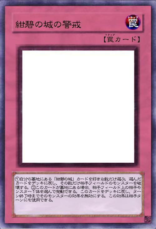 | ①自分の墓地にある「紺碧の城」カードを好きな数だけ選ぶ。選んだカードをデッキに戻し、その数だけ相手フィールドのモンスターを破壊する。②このカードが墓地にある場合、相手フィールド上の相手モンスター1体を選んで発動できる。このカードをデッキに戻し、ターン終了時までそのモンスターの効果を無効にする。この効果は相手ターンにも使用できる。 | |||