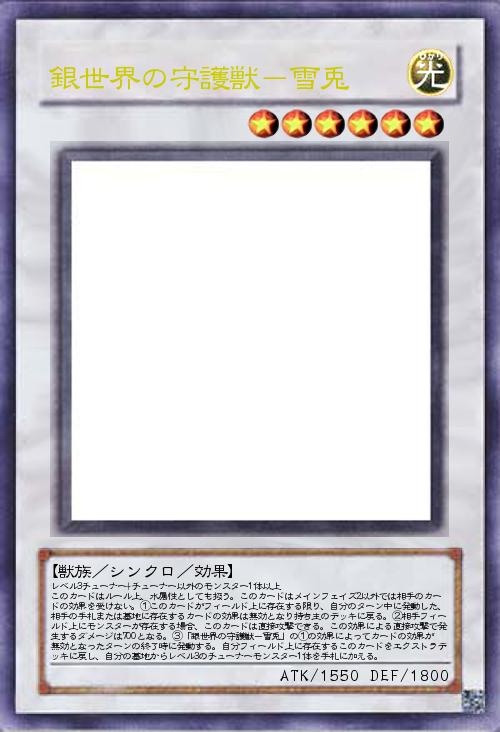| レベル3チューナー+チューナー以外のモンスター1体以上 このカードはルール上、水属性としても扱う。このカードはメインフェイズ2以外では相手のカードの効果を受けない。①このカードがフィールド上に存在する限り、自分のターン中に発動した、相手の手札または墓地に存在するカードの効果は無効となり持ち主のデッキに戻る。②相手フィールド上にモンスターが存在する場合、このカードは直接攻撃できる。この効果による直接攻撃で発生するダメージは700となる。③「銀世界の守護獣-雪兎」の①の効果によってカードの効果が無効となったターンの終了時に発動する。自分フィールド上に存在するこのカードをエクストラデッキに戻し、自分の墓地からレベル3のチューナーモンスター1体を手札に加える。 | |||