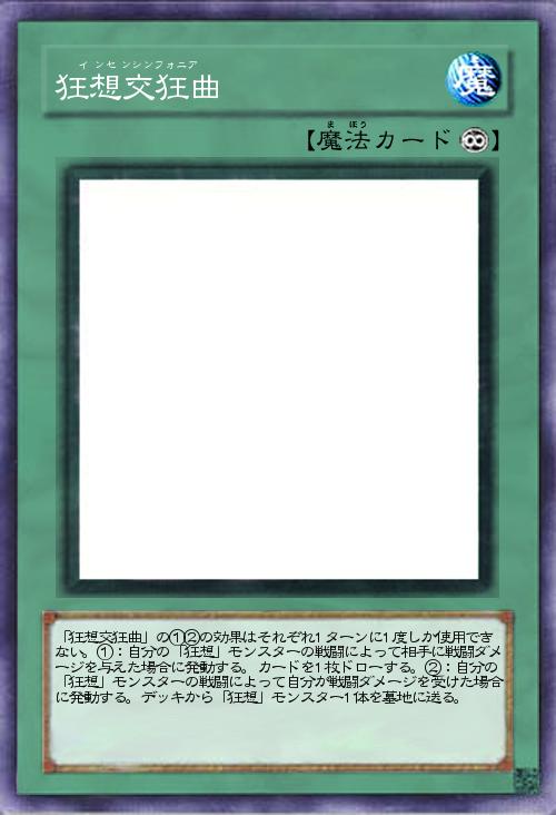 | 「狂想交狂曲」の①②の効果はそれぞれ1ターンに1度しか使用できない。①:自分の「狂想」モンスターの戦闘によって相手に戦闘ダメージを与えた場合に発動する。カードを1枚ドローする。②:自分の「狂想」モンスターの戦闘によって自分が戦闘ダメージを受けた場合に発動する。デッキから「狂想」モンスター1体を墓地に送る。 | |||