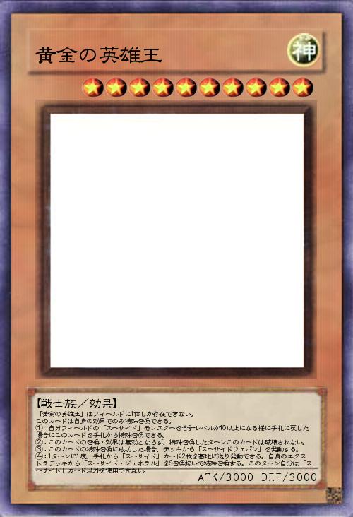| 「黄金の英雄王」はフィールドに1体しか存在できない。 このカードは自身の効果でのみ特殊召喚できる。 ①:自分フィールドの「スーサイド」モンスターを合計レベルが10以上になる様に手札に戻した場合にこのカードを手札から特殊召喚できる。 ②:このカードの召喚・効果は無効とならず、特殊召喚したターンこのカードは破壊されない。 ③:このカードの特殊召喚に成功した場合、デッキから「スーサイドウェポン」を発動する。 ④:1ターンに1度、手札から「スーサイド」カード2枚を墓地に送り発動できる。自身のエクストラデッキから「スーサイド・ジェネラル」をS召喚扱いで特殊召喚する。このターン自分は「スーサイド」カード以外を使用できない。 | |||