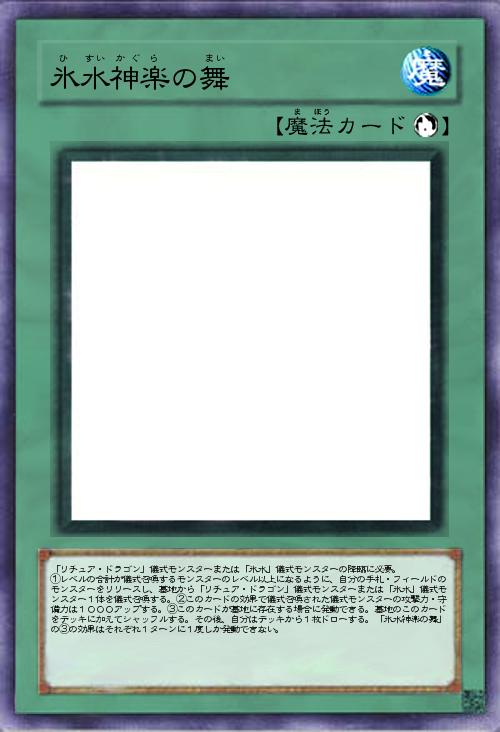 | 「リチュア・ドラゴン」儀式モンスターまたは「氷水」儀式モンスターの降臨に必要。 ①レベルの合計が儀式召喚するモンスターのレベル以上になるように、自分の手札・フィールドのモンスターをリリースし、墓地から「リチュア・ドラゴン」儀式モンスターまたは「氷水」儀式モンスター1体を儀式召喚する。②このカードの効果で儀式召喚された儀式モンスターの攻撃力・守備力は1000アップする。③このカードが墓地に存在する場合に発動できる。墓地のこのカードをデッキに加えてシャッフルする。その後、自分はデッキから1枚ドローする。「氷水神楽の舞」の③の効果はそれぞれ1ターンに1度しか発動できない。 | |||