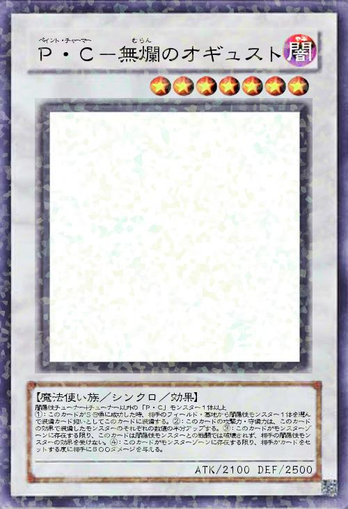 | 闇属性チューナー+チューナー以外の「P・C」モンスター1体以上 ①:このカードがS召喚に成功した時、相手のフィールド・墓地から闇属性モンスター1体を選んで装備カード扱いとしてこのカードに装備する。②:このカードの攻撃力・守備力は、このカードの効果で装備したモンスターのそれぞれの数値の半分アップする。③:このカードがモンスターゾーンに存在する限り、このカードは闇属性モンスターとの戦闘では破壊されず、相手の闇属性モンスターの効果を受けない。④:このカードがモンスターゾーンに存在する限り、相手がカードをセットする度に相手に500ダメージを与える。 | |||