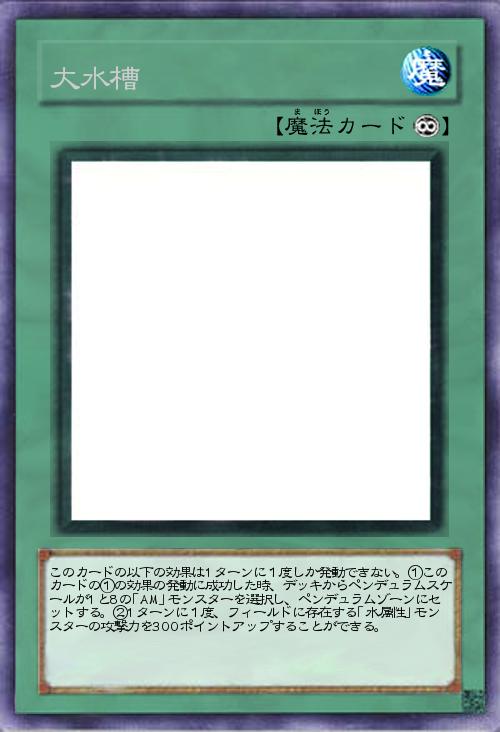 「現在公開中の「遊戯王アクア・ショータイム」の主人公、海斗が使う魔法カードです。水族館にある色んな魚が入ってる大きな水槽がモチーフです。効果の発動に成功した時、デッキから「AM」サーチを行える便利なカードです。」(2016-12-06 23:16)