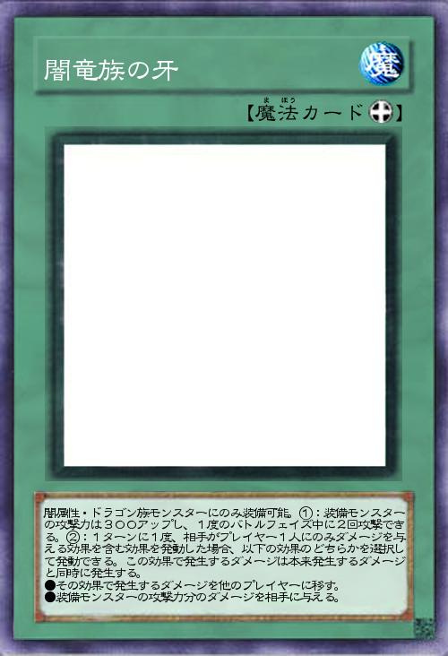 | 闇属性・ドラゴン族モンスターにのみ装備可能。①:装備モンスターの攻撃力は300アップし、1度のバトルフェイズ中に2回攻撃できる。②:1ターンに1度、相手がプレイヤー1人にのみダメージを与える効果を含む効果を発動した場合、以下の効果のどちらかを選択して発動できる。この効果で発生するダメージは本来発生するダメージと同時に発生する。 ●その効果で発生するダメージを他のプレイヤーに移す。 ●装備モンスターの攻撃力分のダメージを相手に与える。 | |||