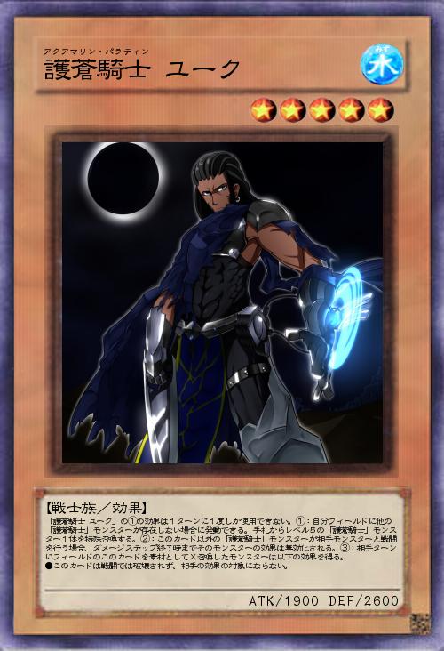 | 「護蒼騎士 ユーク」の①の効果は1ターンに1度しか使用できない。①:自分フィールドに他の「護蒼騎士」モンスターが存在しない場合に発動できる。手札からレベル5の「護蒼騎士」モンスター1体を特殊召喚する。②:このカード以外の「護蒼騎士」モンスターが相手モンスターと戦闘を行う場合、ダメージステップ終了時までそのモンスターの効果は無効化される。③:相手ターンにフィールドのこのカードを素材としてX召喚したモンスターは以下の効果を得る。 ●このカードは戦闘では破壊されず、相手の効果の対象にならない。 | |||