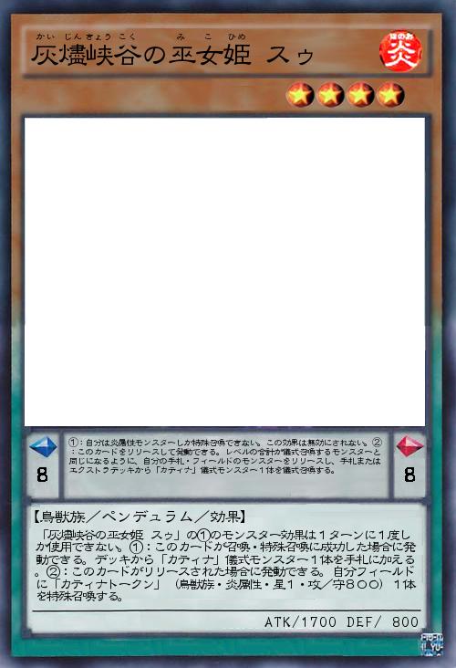 | 「灰燼峡谷の巫女姫 スゥ」の①のモンスター効果は1ターンに1度しか使用できない。①:このカードが召喚・特殊召喚に成功した場合に発動できる。デッキから「カティナ」儀式モンスター1体を手札に加える。②:このカードがリリースされた場合に発動できる。自分フィールドに「カティナトークン」(鳥獣族・炎属性・星1・攻/守800)1体を特殊召喚する。 | |||