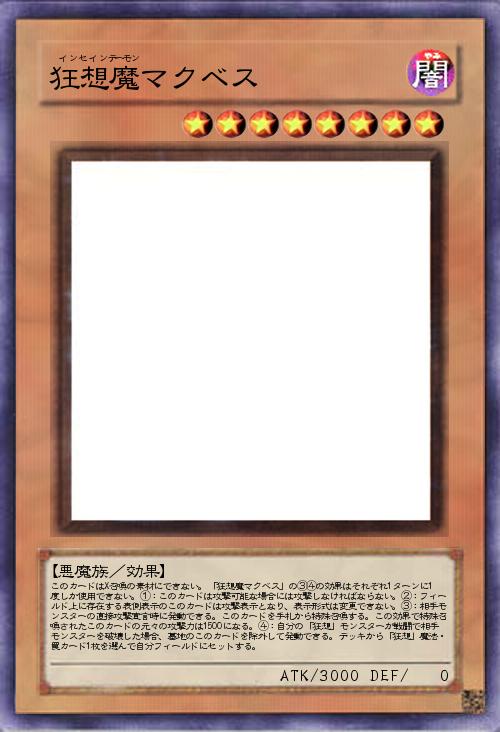 | このカードはX召喚の素材にできない。「狂想魔マクベス」の③④の効果はそれぞれ1ターンに1度しか使用できない。①:このカードは攻撃可能な場合には攻撃しなければならない。②:フィールド上に存在する表側表示のこのカードは攻撃表示となり、表示形式は変更できない。③:相手モンスターの直接攻撃宣言時に発動できる。このカードを手札から特殊召喚する。この効果で特殊召喚されたこのカードの元々の攻撃力は1500になる。④:自分の「狂想」モンスターが戦闘で相手モンスターを破壊した場合、墓地のこのカードを除外して発動できる。デッキから「狂想」魔法・罠カード1枚を選んで自分フィールドにセットする。 | |||