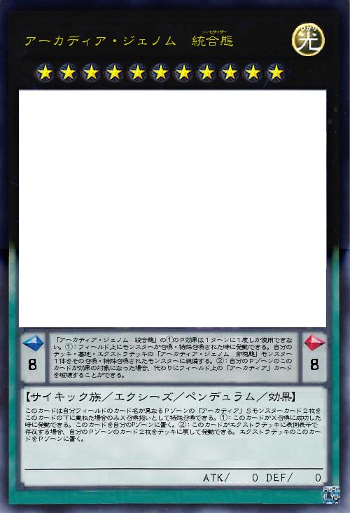 | 「アーカディア・ジェノム 統合態」の①のP効果は1ターンに1度しか使用できない。①:フィールド上にモンスターが召喚・特殊召喚された時に発動できる。自分のデッキ・墓地・エクストラデッキの「アーカディア・ジェノム 卵塊態」モンスター1体をその召喚・特殊召喚されたモンスターに装備する。②:自分のPゾーンのこのカードが効果の対象になった場合、代わりにフィールド上の「アーカディア」カードを破壊することができる。 | |||
