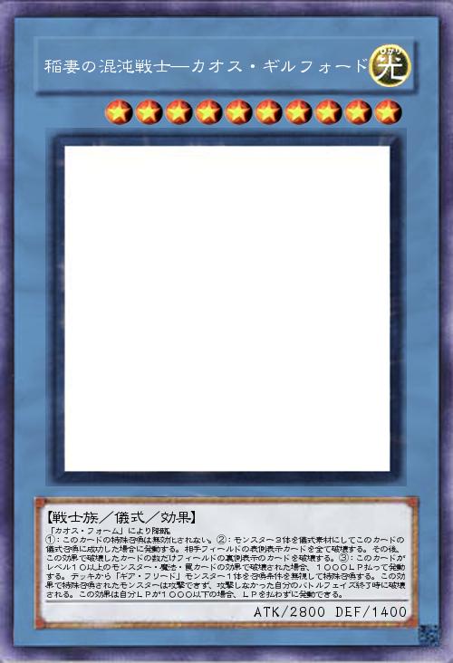 | 「カオス・フォーム」により降臨。 ①:このカードの特殊召喚は無効化されない。②:モンスター3体を儀式素材にしてこのカードの儀式召喚に成功した場合に発動する。相手フィールドの表側表示カードを全て破壊する。その後、この効果で破壊したカードの数だけフィールドの裏側表示のカードを破壊する。③:このカードがレベル10以上のモンスター・魔法・罠カードの効果で破壊された場合、1000LP払って発動する。デッキから「ギア・フリード」モンスター1体を召喚条件を無視して特殊召喚する。この効果で特殊召喚されたモンスターは攻撃できず、攻撃しなかった自分のバトルフェイズ終了時に破壊される。この効果は自分LPが1000以下の場合、LPを払わずに発動できる。 | |||
