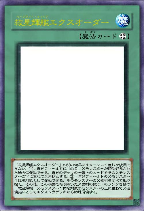 | 「救星輝艦エクスオーダー」の②の効果は1ターンに1度しか使用できない。①:自分フィールドに「救星」Xモンスターが特殊召喚された場合に発動できる。自分のデッキの一番上のカードをそのXモンスターの下に重ねてX素材とする。②:自分フィールドのXモンスター1体を対象として発動できる。そのモンスターのX素材をすべて取り除く。その後、この効果で取り除いたX素材の数以下のランクを持つ「救星輝機」Xモンスター1体を対象のモンスターの上に重ねてX召喚扱いとしてエクストラデッキから特殊召喚する。 | |||
