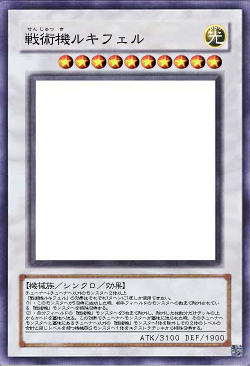 | チューナー+チューナー以外のモンスター2体以上 「戦術機ルキフェル」の効果はそれぞれ1ターンに1度しか使用できない。 (1):このモンスターがS召喚に成功した時、相手フィールドのモンスターの数まで除外されている「戦術機」モンスターを特殊召喚する。 (2):自分フィールドの「戦術機」モンスターを3枚まで除外し、除外した枚数分だけデッキの上からカードを墓地へ送る。この効果でチューナーモンスターが墓地に送られた時、そのチューナーモンスターと墓地にあるチューナー以外の「戦術機」モンスター1体を除外しその2体のレベルの合計と同じレベルを持つ機械族Sモンスター1体をエクストラデッキから特殊召喚する。 | |||
