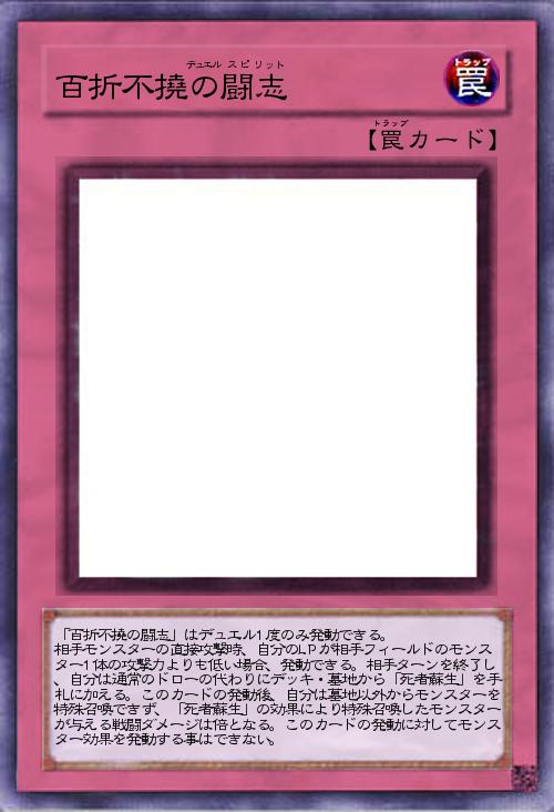 | 「百折不撓の闘志」はデュエル1度のみ発動できる。 相手モンスターの直接攻撃時、自分のLPが相手フィールドのモンスター1体の攻撃力よりも低い場合、発動できる。相手ターンを終了し、自分は通常のドローの代わりにデッキ・墓地から「死者蘇生」を手札に加える。このカードの発動後、自分は墓地以外からモンスターを特殊召喚できず、「死者蘇生」の効果により特殊召喚したモンスターが与える戦闘ダメージは倍となる。このカードの発動に対してモンスター効果を発動する事はできない。 | |||