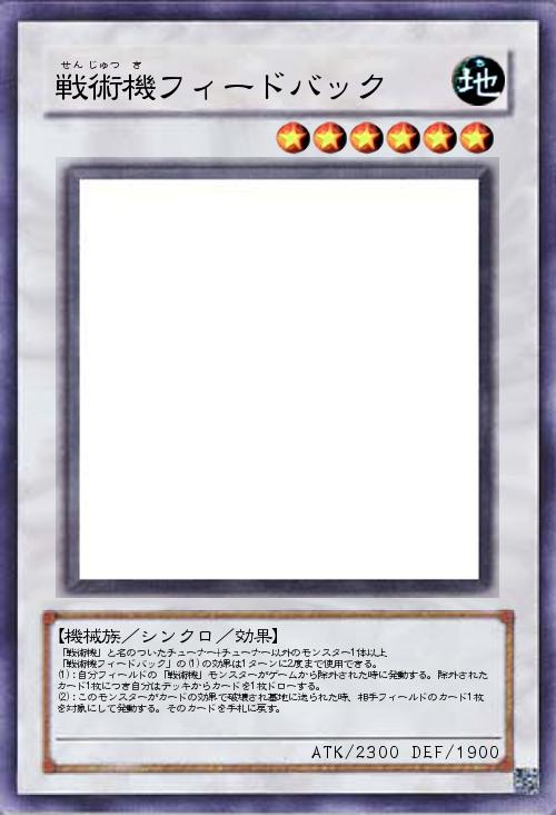 | 「戦術機」と名のついたチューナー+チューナー以外のモンスター1体以上 「戦術機フィードバック」の(1)の効果は1ターンに2度まで使用できる。 (1):自分フィールドの「戦術機」モンスターがゲームから除外された時に発動する。除外されたカード1枚につき自分はデッキからカードを1枚ドローする。 (2):このモンスターがカードの効果で破壊され墓地に送られた時、相手フィールドのカード1枚を対象にして発動する。そのカードを手札に戻す。 | |||