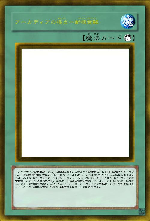 | 「アーカディアの覚醒態 シス」の降臨に必要。このカードの発動に対して相手は魔法・罠・モンスターの効果を発動できない。①:自分フィールドから、レベルの合計が10以上になるようにレベル4以下の「アーカディア」モンスターをリリースし、エクストラデッキから「アーカディアの覚醒態 シス」を儀式召喚する。このカードによる儀式召喚は「アーカディア」モンスター以外のモンスターを使用できない。②:自分フィールドの「アーカディアの覚醒態 シス」が相手によりフィールドから離れる場合、代わりに墓地のこのカードを除外できる。 | |||