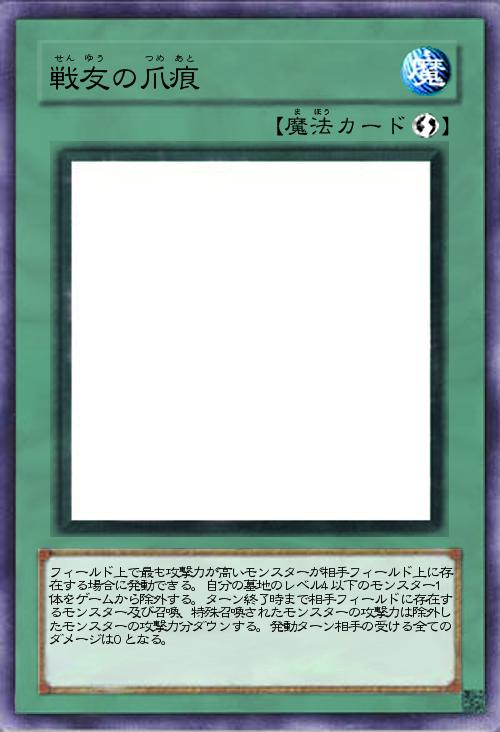 「敵モンスターの大幅な弱体化を見込めるカード。(レベル4以下で一番攻撃力高いのってワイゼル∞でしたっけ)しかし相手は無傷とまあそういう感じです。死んで言った仲間のつけた傷が弱点になるとか隙を生んだとか熱い展開をイメージしてますがぶっちゃけご都合で生まれた効果です。」(2016-12-16 17:49)