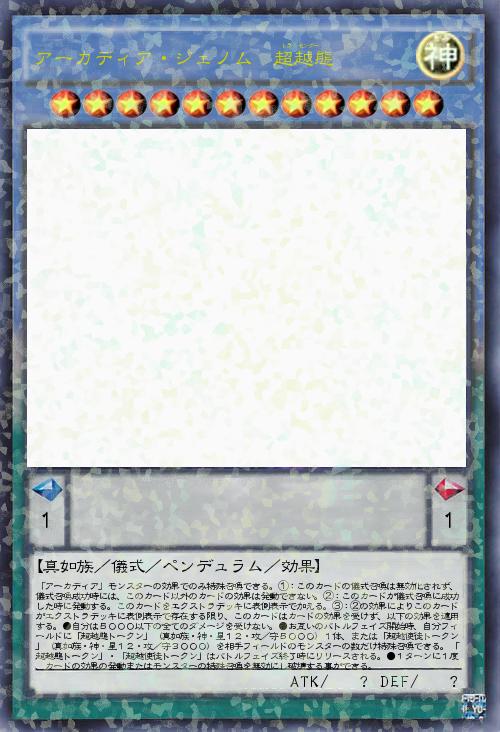 | 「アーカディア」モンスターの効果でのみ特殊召喚できる。①:このカードの儀式召喚は無効化されず、儀式召喚成功時には、このカード以外のカードの効果は発動できない。②:このカードが儀式召喚に成功した時に発動する。このカードをエクストラデッキに表側表示で加える。③:②の効果によりこのカードがエクストラデッキに表側表示で存在する限り、このカードはカードの効果を受けず、以下の効果を適用する。●自分は5000以下の全てのダメージを受けない。●お互いのバトルフェイズ開始時、自分フィールドに「超越態トークン」(真如族・神・星12・攻/守5000)1体、または「超越使徒トークン」(真如族・神・星12・攻/守3000)を相手フィールドのモンスターの数だけ特殊召喚できる。「超越態トークン」・「超越使徒トークン」はバトルフェイズ終了時にリリースされる。●1ターンに1度、カードの効果の発動またはモンスターの特殊召喚を | |||
