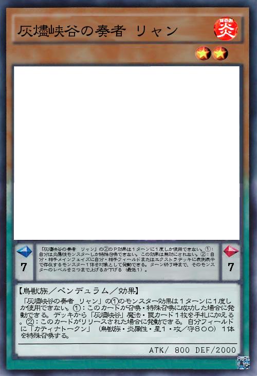 | 「灰燼峡谷の奏者 リャン」の①のモンスター効果は1ターンに1度しか使用できない。①:このカードが召喚・特殊召喚に成功した場合に発動できる。デッキから「灰燼峡谷」魔法・罠カード1枚を手札に加える。②:このカードがリリースされた場合に発動できる。自分フィールドに「カティナトークン」(鳥獣族・炎属性・星1・攻/守800)1体を特殊召喚する。 | |||