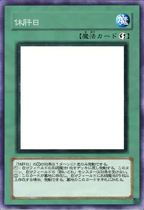 | 「休肝日」の②の効果は1ターンに1度のみ発動できる。 ①:自分フィールドの永続魔法1枚をデッキに戻し発動する。このターン、自分フィールドの「酔いどれ」モンスターは効果を受けない。 ②:このカードが墓地に存在し、自分フィールドに永続魔法が3枚以上存在する場合、発動できる。墓地のこのカードを手札に加える。 | |||
