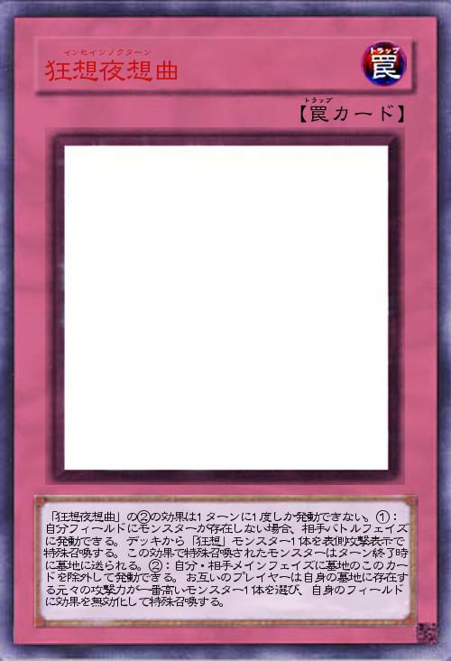 | 「狂想夜想曲」の②の効果は1ターンに1度しか発動できない。①:自分フィールドにモンスターが存在しない場合、相手バトルフェイズに発動できる。デッキから「狂想」モンスター1体を表側攻撃表示で特殊召喚する。この効果で特殊召喚されたモンスターはターン終了時に墓地に送られる。②:自分・相手メインフェイズに墓地のこのカードを除外して発動できる。お互いのプレイヤーは自身の墓地に存在する元々の攻撃力が一番高いモンスター1体を選び、自身のフィールドに効果を無効化して特殊召喚する。 | |||