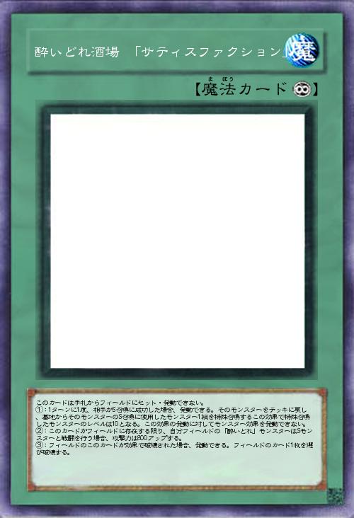 | このカードは手札からフィールドにセット・発動できない。 ①:1ターンに1度、相手がS召喚に成功した場合、発動できる。そのモンスターをデッキに戻し、墓地からそのモンスターのS召喚に使用したモンスター1組を特殊召喚するこの効果で特殊召喚したモンスターのレベルは10となる。この効果の発動に対してモンスター効果を発動できない。 ②:このカードがフィールドに存在する限り、自分フィールドの「酔いどれ」モンスターはSモンスターと戦闘を行う場合、攻撃力は800アップする。 ③:フィールドのこのカードが効果で破壊された場合、発動できる。フィールドのカード1枚を選び破壊する。 | |||