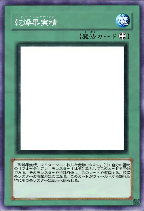 | 「乾燥果実精」は1ターンに1枚しか発動できない。①:自分の墓地の「フルーティアン」モンスター1体を対象としてこのカードを発動できる。そのモンスターを特殊召喚し、このカードを装備する。装備モンスターの攻撃力は0になる。このカードがフィールドから離れた時にそのモンスターは墓地へ送られる。 | |||