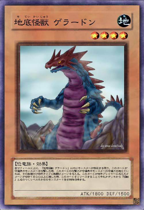 | 自分フィールド上に、「地底怪獣 ゲラードン」以外にモンスターが存在する限り、このカードが守備表示モンスターを攻撃した時、このカードの攻撃力が守備表示モンスターの守備力を越えていれば、その数値だけ相手ライフに戦闘ダメージを与える。このカードが相手プレイヤーに与えたダメージが合計1800以上に達した時、このカードをリリースすることで手札かデッキから「怪獣」と名のつくレベル5か6のモンスター1体を特殊召喚する。 | |||