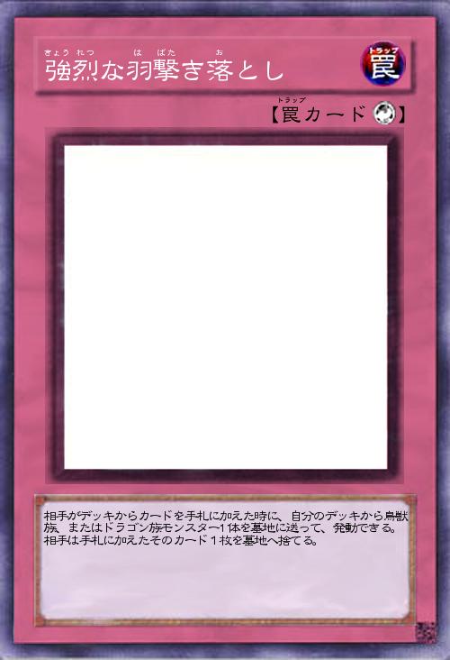 | 相手がデッキからカードを手札に加えた時に、自分のデッキから鳥獣族、またはドラゴン族モンスター1体を墓地に送って、発動できる。 相手は手札に加えたそのカード1枚を墓地へ捨てる。 | |||