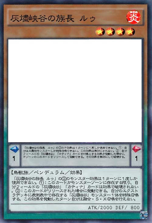 | 「灰燼峡谷の族長 ルゥ」の②のP効果は1ターンに1度しか使用できない。①:自分は炎属性モンスターしか特殊召喚できない。この効果は無効にされない。②:自分フィールドの「灰燼峡谷」「カティナ」カードを対象とする効果が発動した場合に、Pゾーンのこのカードをリリースして発動できる。その効果を無効にして破壊する。 | |||