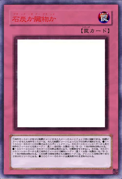 | ①相手モンスターが自分に戦闘ダメージを与えたターンのエンドフェイズ時に発動できる。戦闘ダメージを与えた相手モンスターは、与えた戦闘ダメージによって以下の効果が適用される。●1ー1000…そのカードの攻撃力は800ポイントダウンし、そのカードのコントローラーから見て相手のフィールドに石炭トークン(星1・岩石族・炎属性・攻/守 0)1体が特殊召喚される。●1001ー2000…そのカードの効果は無効になり、攻撃宣言もできない。その後、そのカードのコントローラーから見て相手のフィールドに臓物トークン(星1・水族・地属性・攻/守 0)1体が特殊召喚される。この効果で特殊召喚された臓物トークンは、アドバンス召喚の時1体で2体分のリリースとなる。●2001ー…そのカードは裏側表示のまま除外される。 | |||