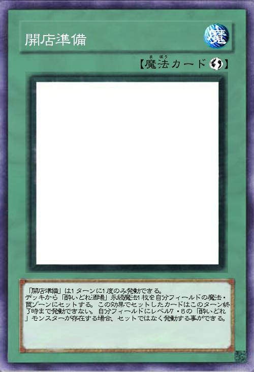 | 「開店準備」は1ターンに1度のみ発動できる。 デッキから「酔いどれ酒場」永続魔法1枚を自分フィールドの魔法・罠ゾーンにセットする。この効果でセットしたカードはこのターン終了時まで発動できない。自分フィールドにレベル7・8の「酔いどれ」モンスターが存在する場合、セットではなく発動する事ができる。 | |||