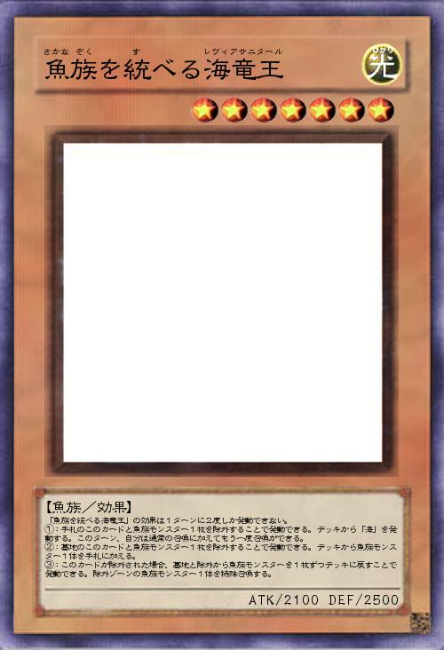 | 「魚族を統べる海竜王」の効果は1ターンに2度しか発動できない。 ①:手札のこのカードと魚族モンスター1枚を除外することで発動できる。デッキから「海」を発動する。このターン、自分は通常の召喚に加えてもう一度召喚ができる。 ②:墓地のこのカードと魚族モンスター1枚を除外することで発動できる。デッキから魚族モンスター1体を手札に加える。 ③:このカードが除外された場合、墓地と除外から魚族モンスターを1枚ずつデッキに戻すことで発動できる。除外ゾーンの魚族モンスター1体を特殊召喚する。 | |||