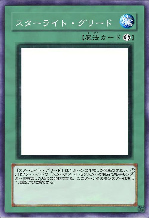 | 「スターライト・グリード」は1ターンに1枚しか発動できない。①:自分フィールドの「スターダスト」モンスターが戦闘で相手モンスターを破壊した場合に発動できる。このターンそのモンスターはもう1度続けて攻撃できる。 | |||